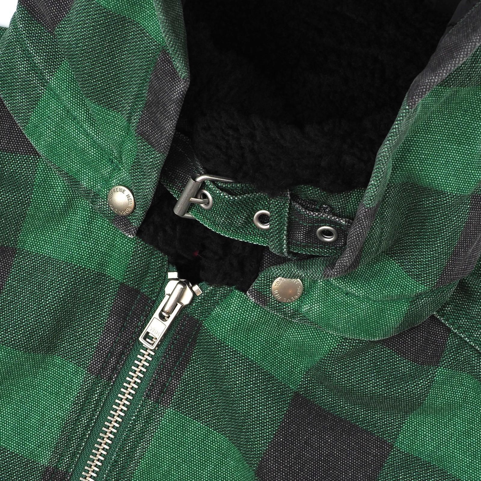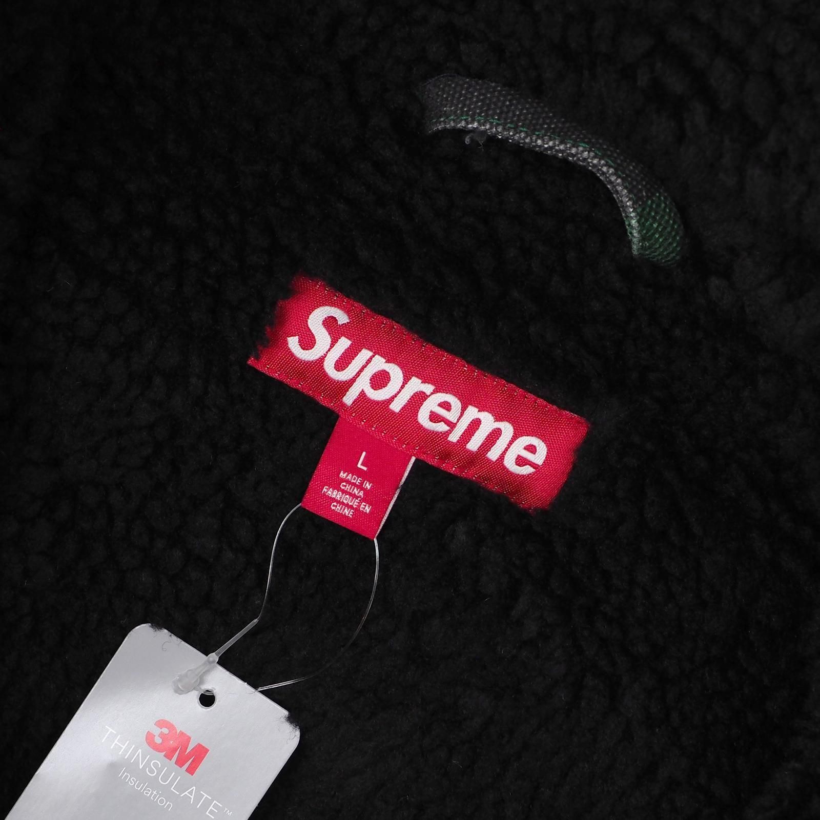 ここ数年人気の高いボア付きのボンバージャケット襟、裏地にはフェイクシアリングを使用し、更に中綿には3MのThinsulate(シンサレート)が詰まっています。バックにはSupremeのロゴが刺繍で入っていますフードはスナップボタンでの着脱となります。襟にはバックルが付いており、しっかりと首元を閉める事も可能です。フロント下部にウェルトハンドポケット、内側に胸ポケット付きます
