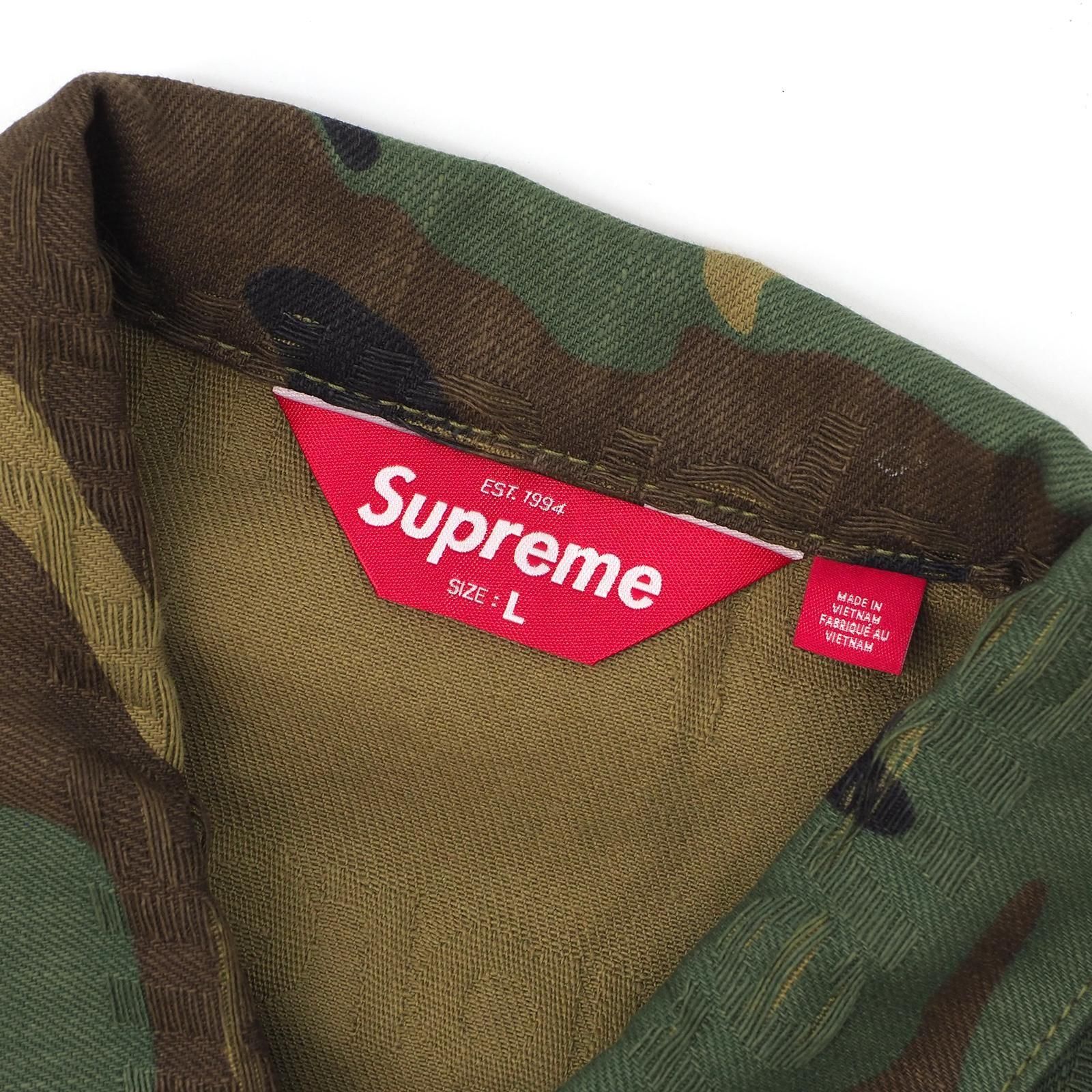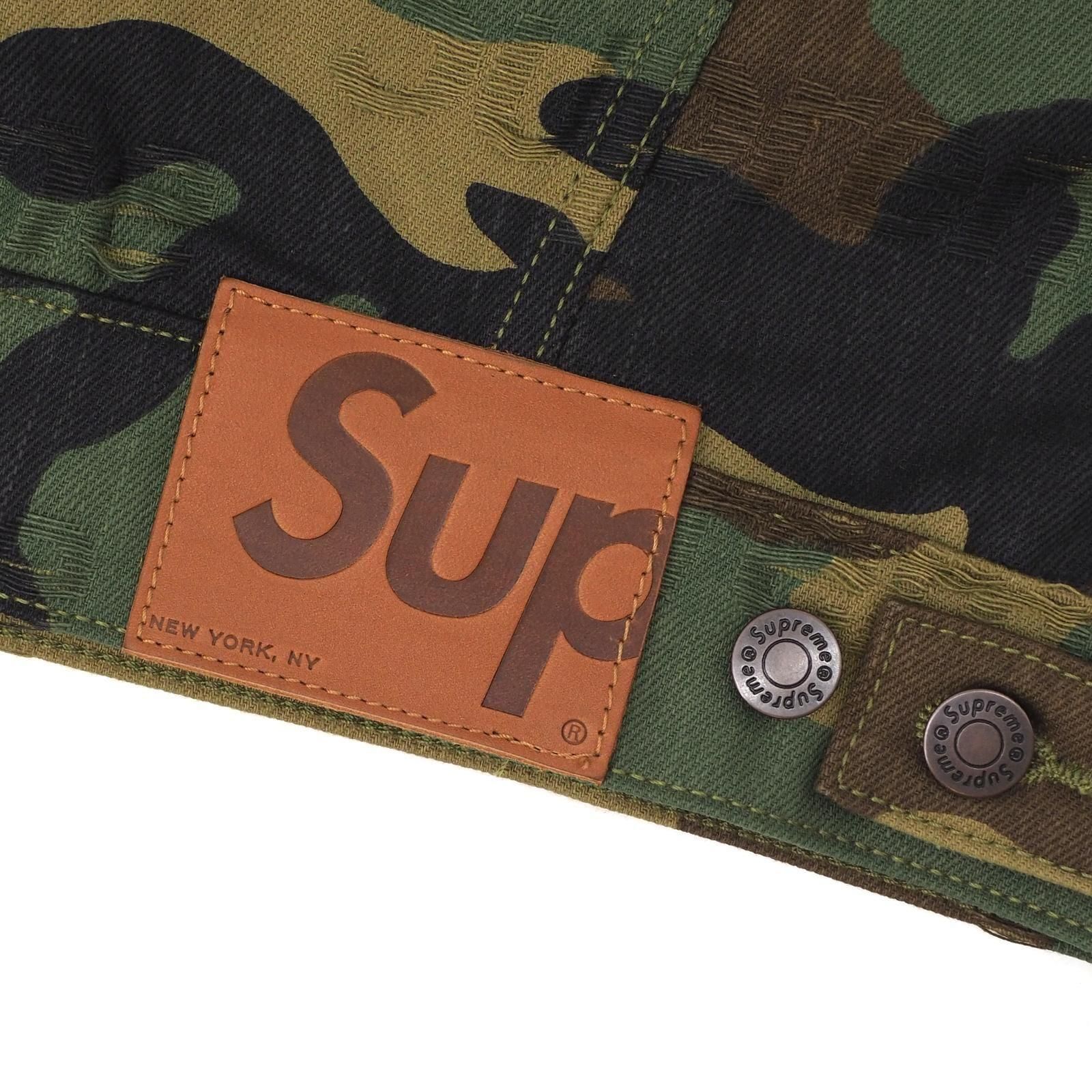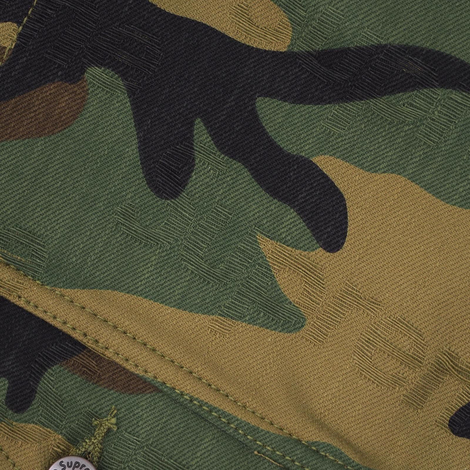 14オンスのコットンデニムを採用し、フリンジ加工のジャカードロゴを全体に施した3rdタイプのデニムジャケットボタンフロント仕様で、胸にはフラップポケット、フロント下部にはシームポケットを配置袖口と裾のタブアジャスター、そして背面のレザーロゴパッチがディテールを引き立てます