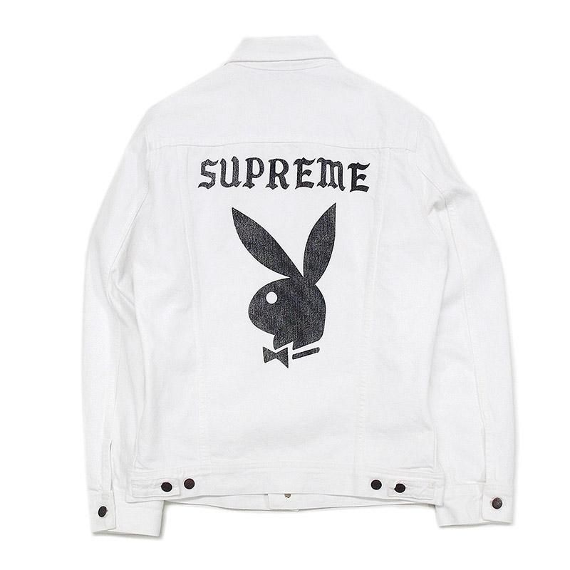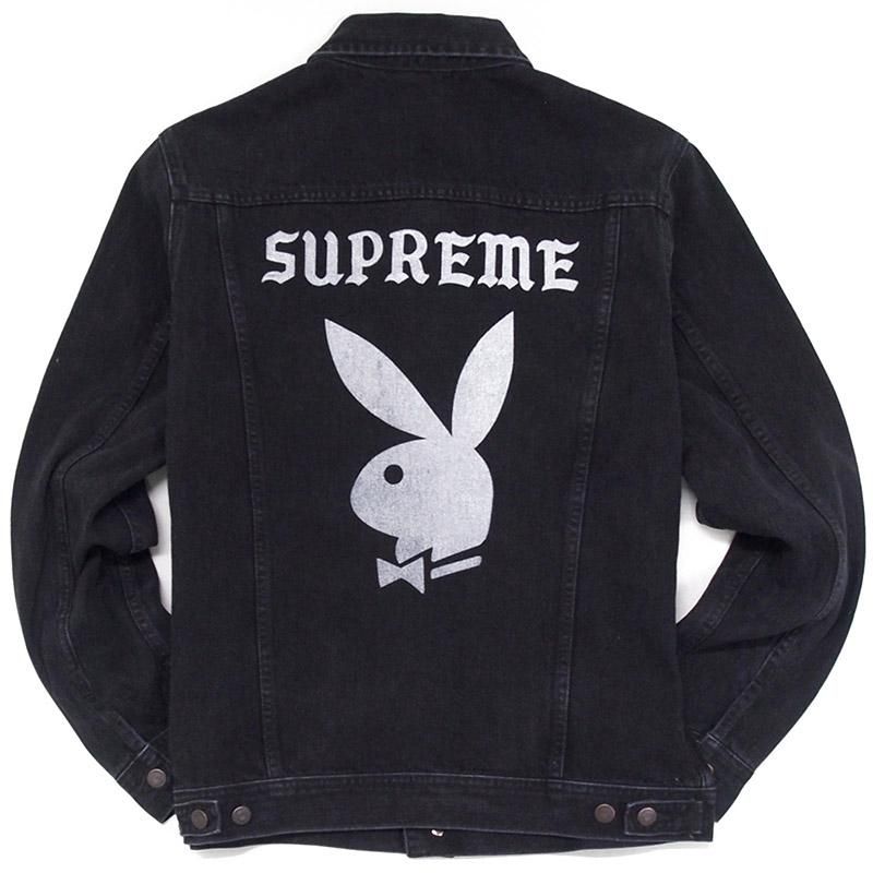 Leeの名作をサンプリングしたSupremeオリジナルのデニムジャケットのバックにPlayboyのアイコンであるラビットヘッドとSupremeのロゴがプリントでしっかりと入ります